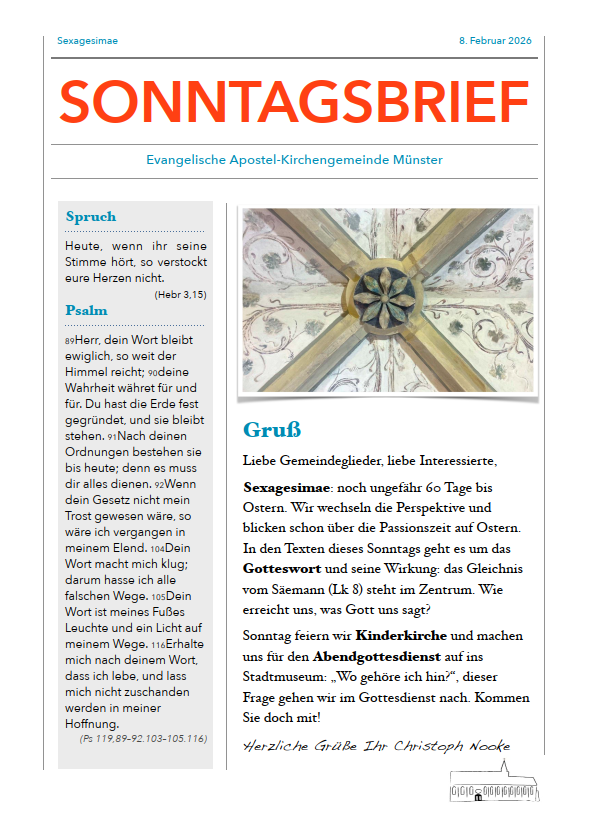 Apostel am Abend. Der Gottesdienst am 8.2.26 findet um 18 Uhr im Stadtmuseum Münster, Salzstraße 28 statt. Gemeinsam mit Direktorin Dr. Rommé gehen wie der Frage nach „Wo gehöre ich hin?“ und fragen nach der Verantwortung für unsere Stadt, die sowohl aus der Stadtgeschichte als auch aus dem Glauben erwächst. Im Anschluss an den Gottesdienst laden wir zu Gesprächen und Getränken ein. Die weiteren Termine sind hier zu finden.