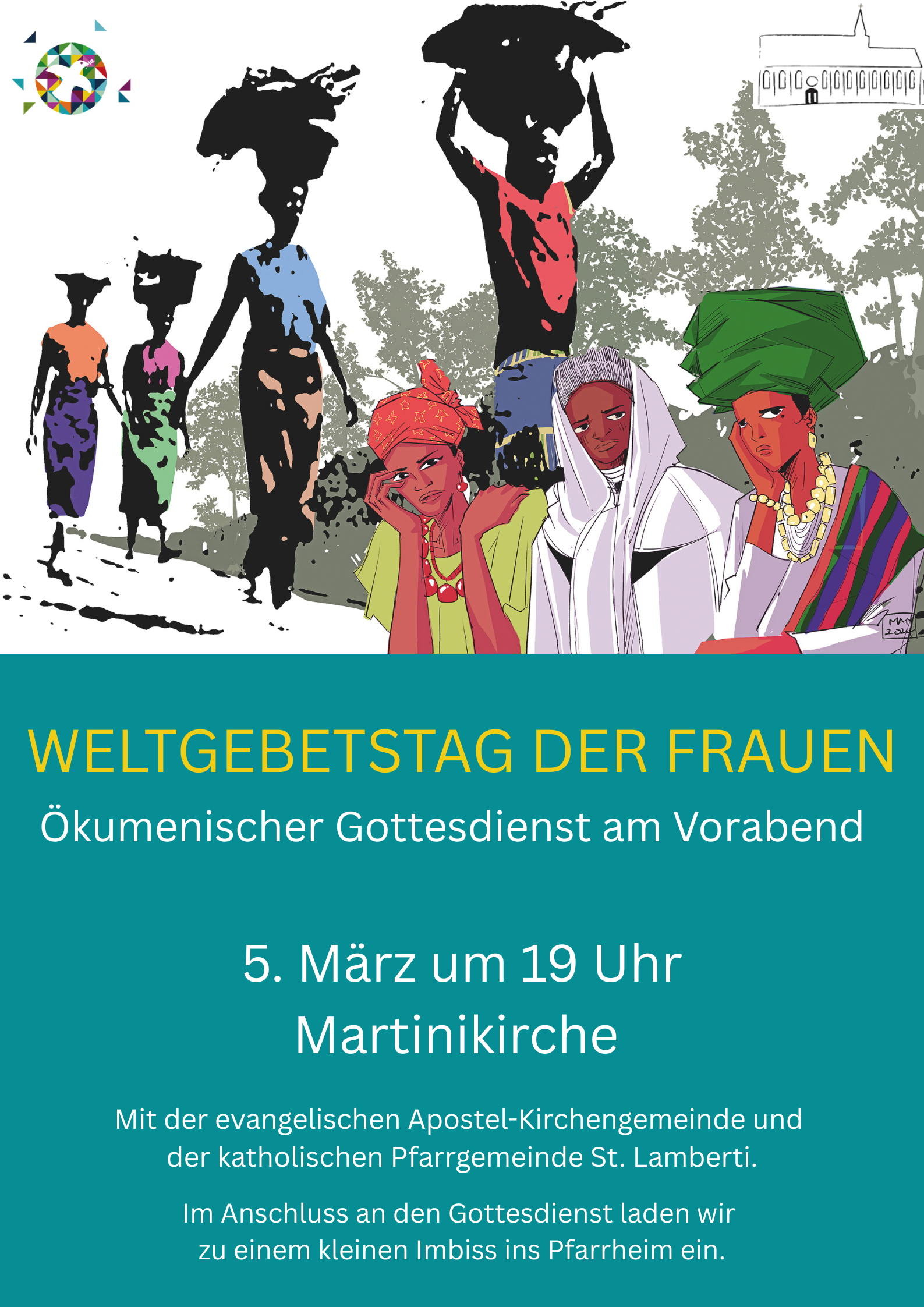 Weltgebetstag. Seit fast 100 Jahren gibt es die schöne Tradition, am ersten Freitag im März (6.3.26) einen von Frauen gestalteten Gottesdienst überall auf der Welt gleichzeitig zu feiern. Der Gottesdienst kommt in diesem Jahr von Frauen aus Nigeria. In diesem Jahr wollen wir, die Apostelgemeinde und die kath. Gemeinde St. Lamberti, erstmalig ökumenisch versuchen, jüngere Frauen für diese Tradition zu begeistern und laden ein zu einem Vorabendgottesdienst in der Martini Kirche (Neubrückenstr.) am 5. März um 19 Uhr. Nach dem Gottesdienst laden wir ein zum Beisammensein bei einem Imbiss im Pfarrheim. Weitere Informationen auch hier.