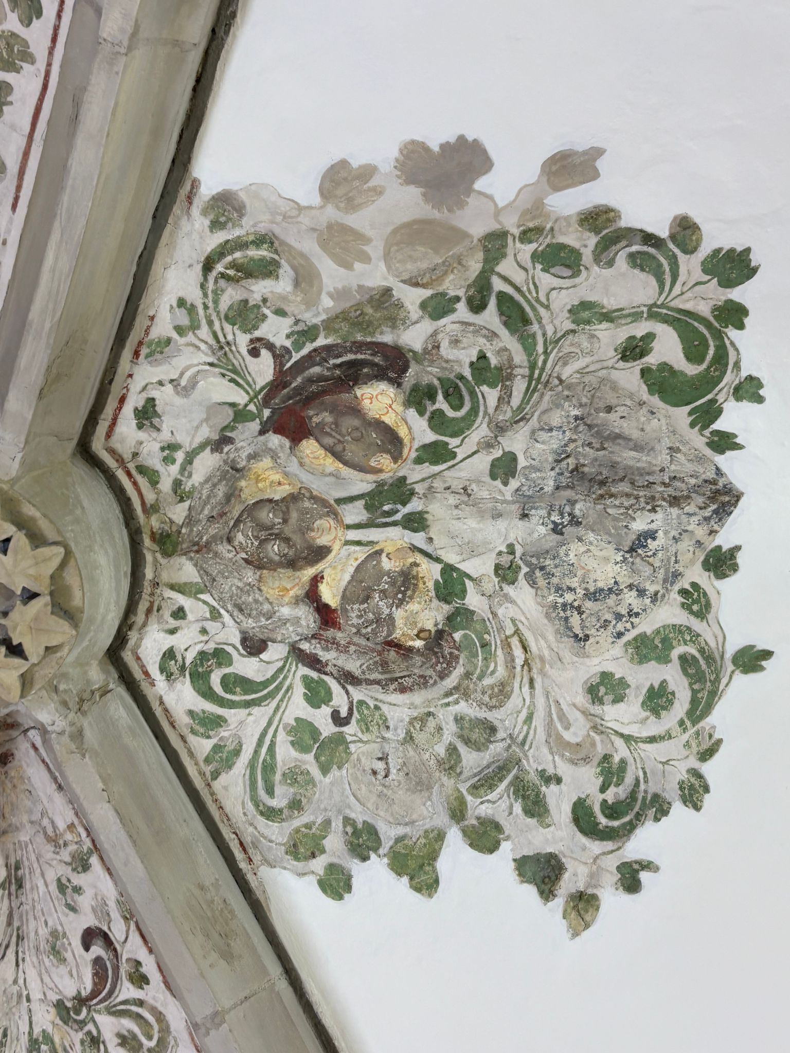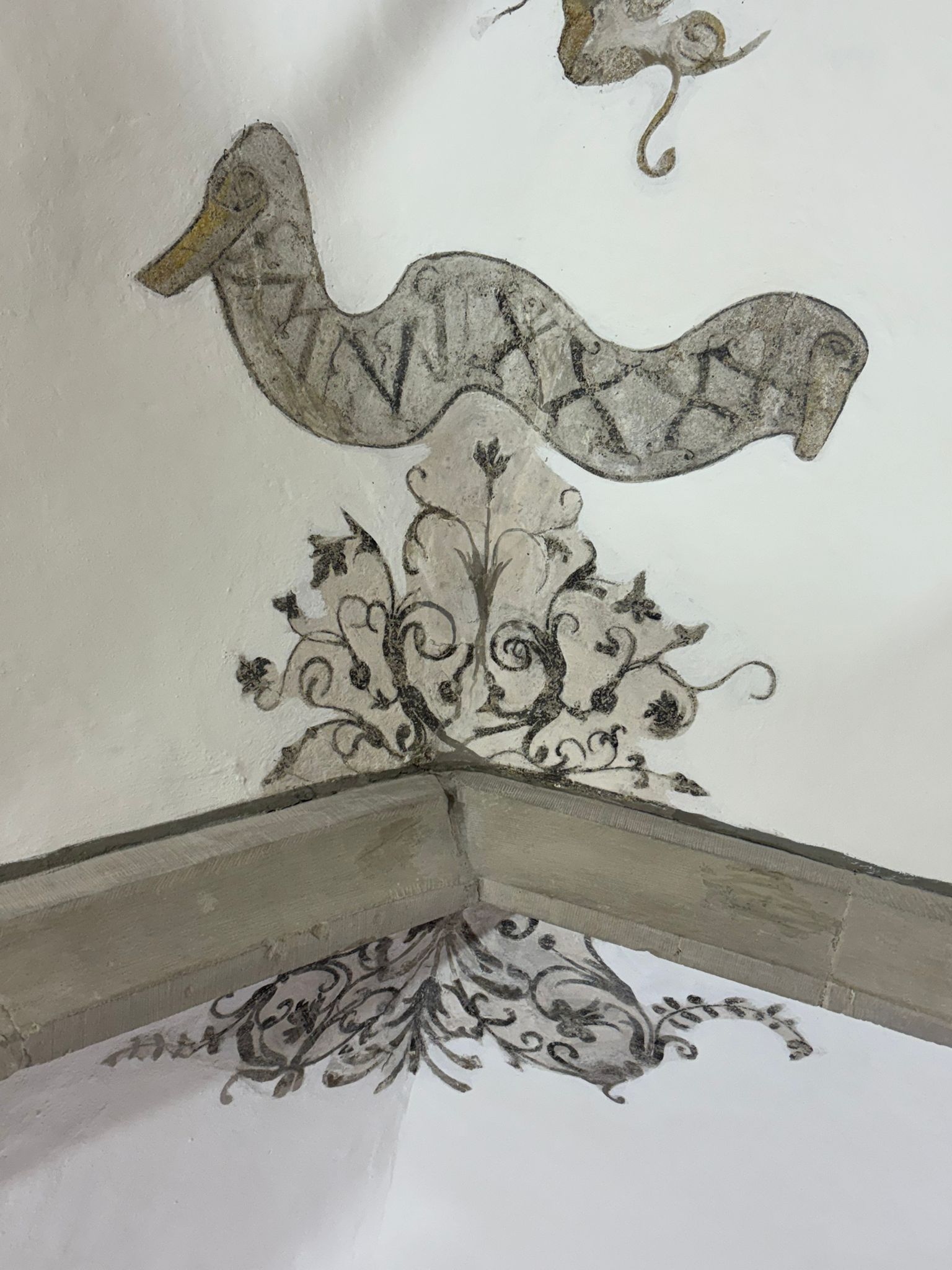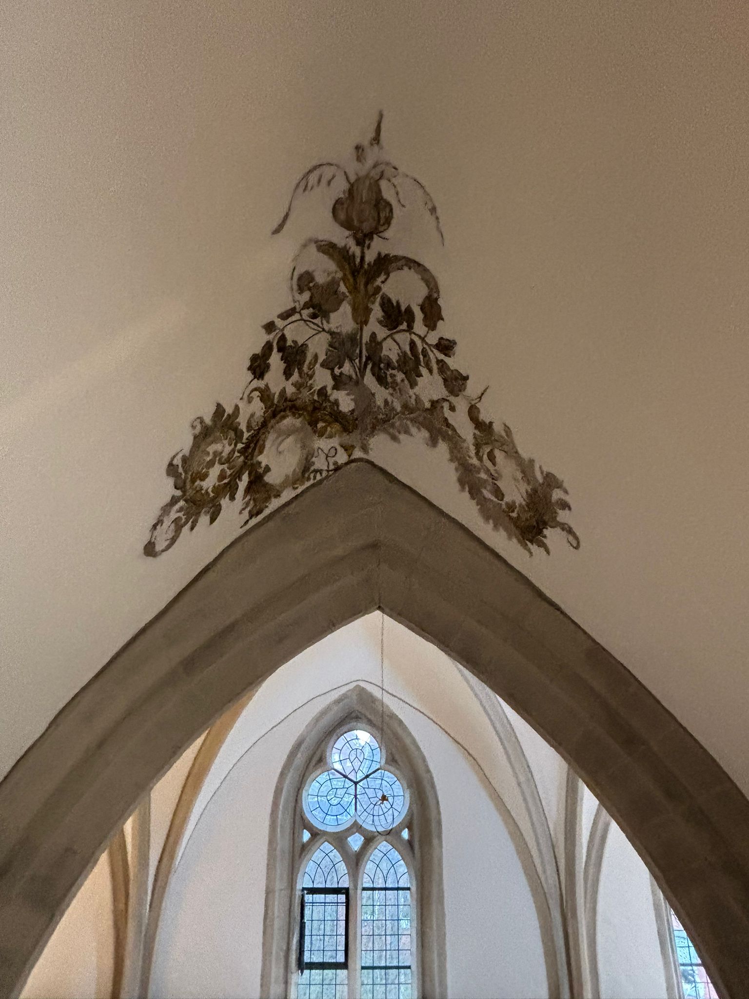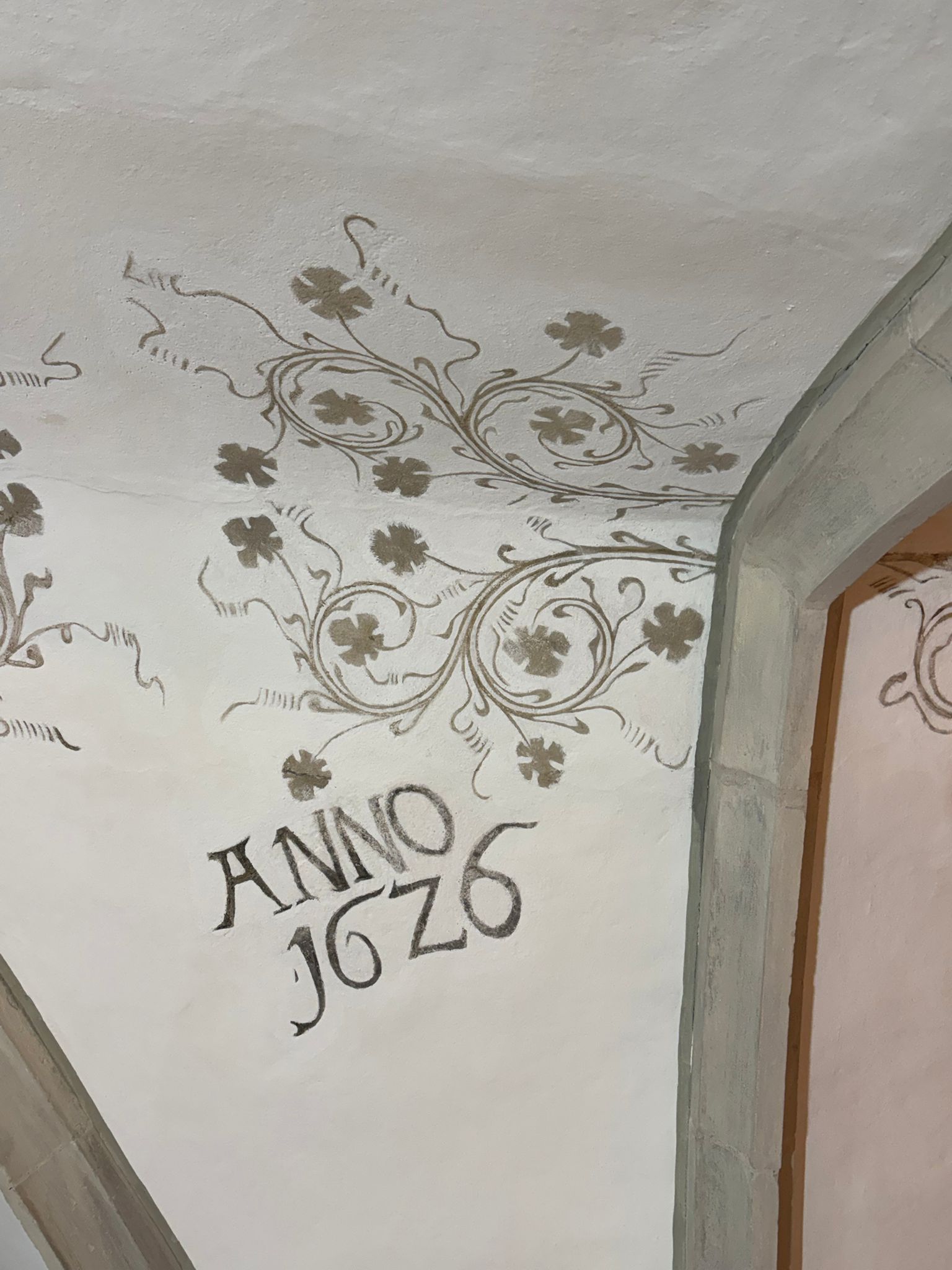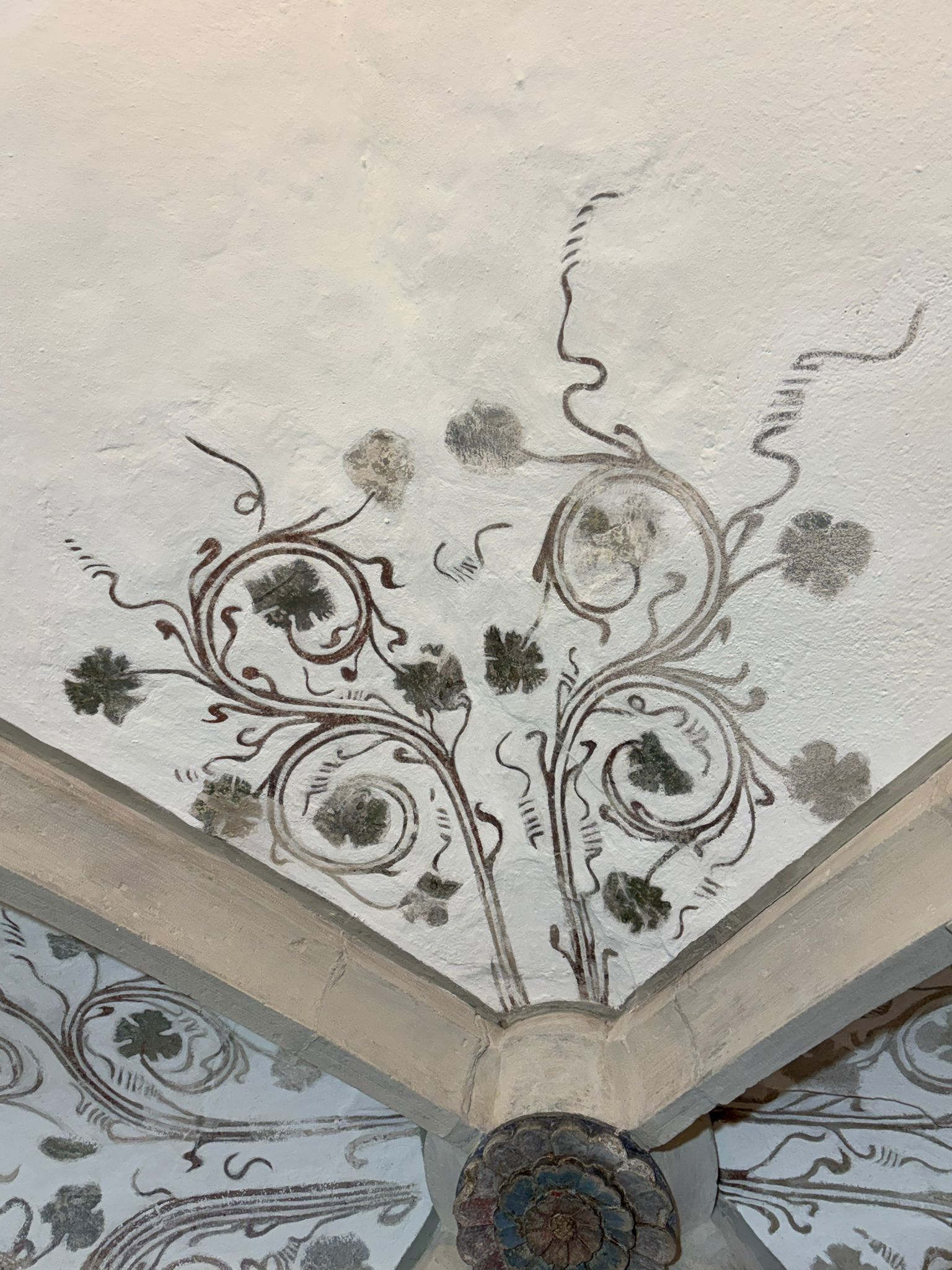 Auf dem Foto kann man sehr schön das freigelegte Blatt erkennen. So, wie dieses Blatt soll die gesamte Malerei freigelegt werden. Es gibt insgesamt 24 Malereien, welche freigelegt werden sollen. Spenden hier.