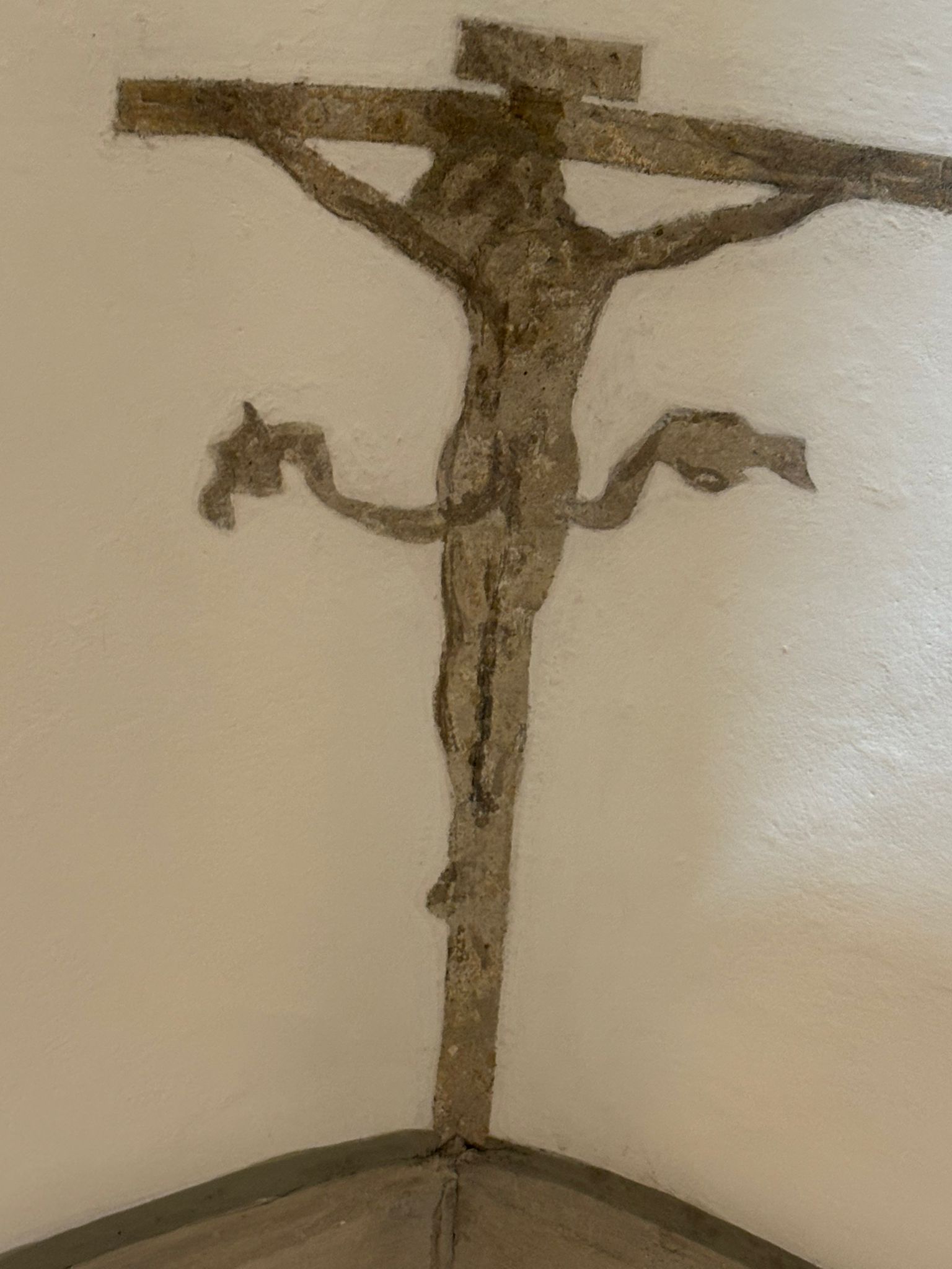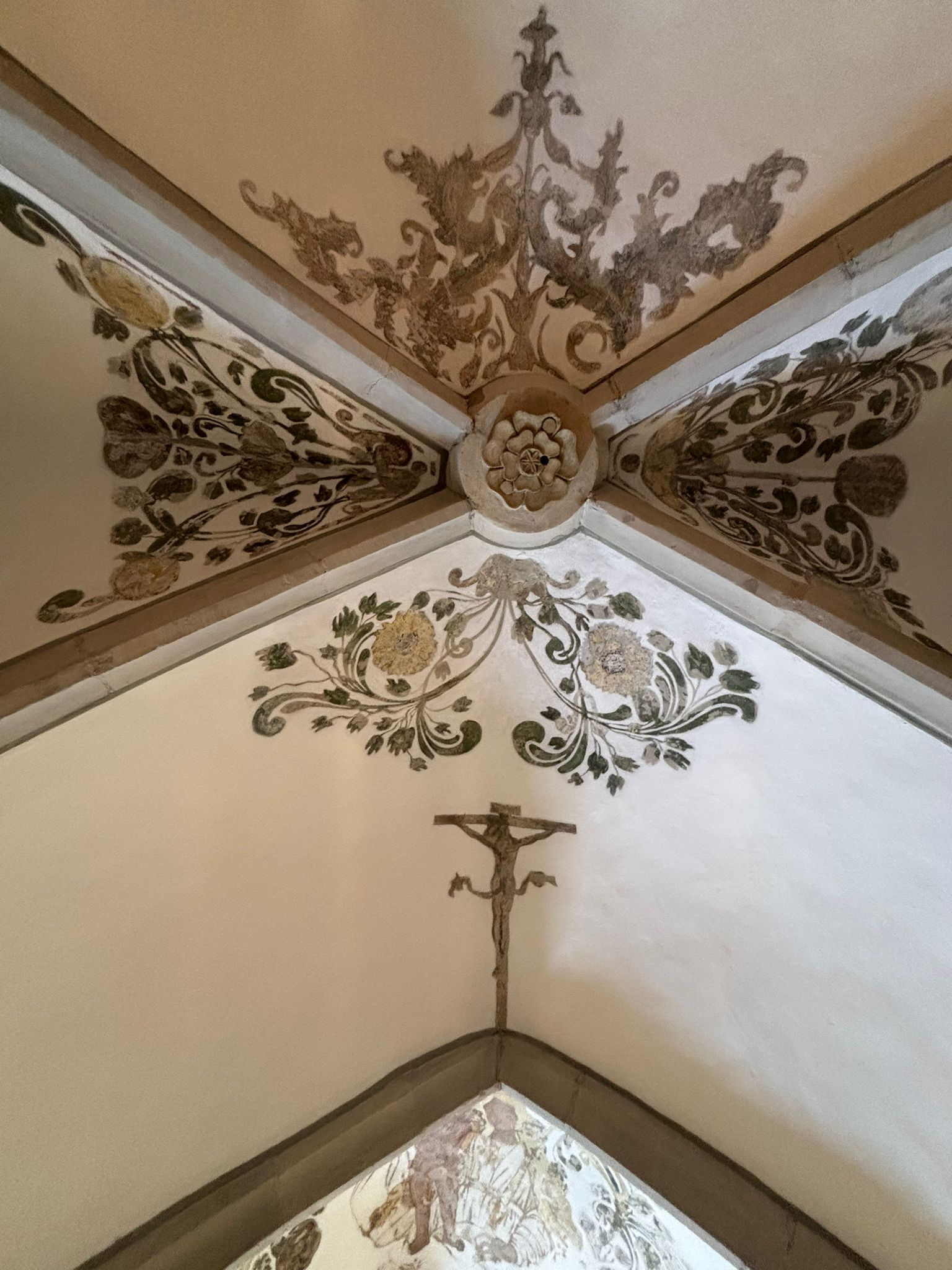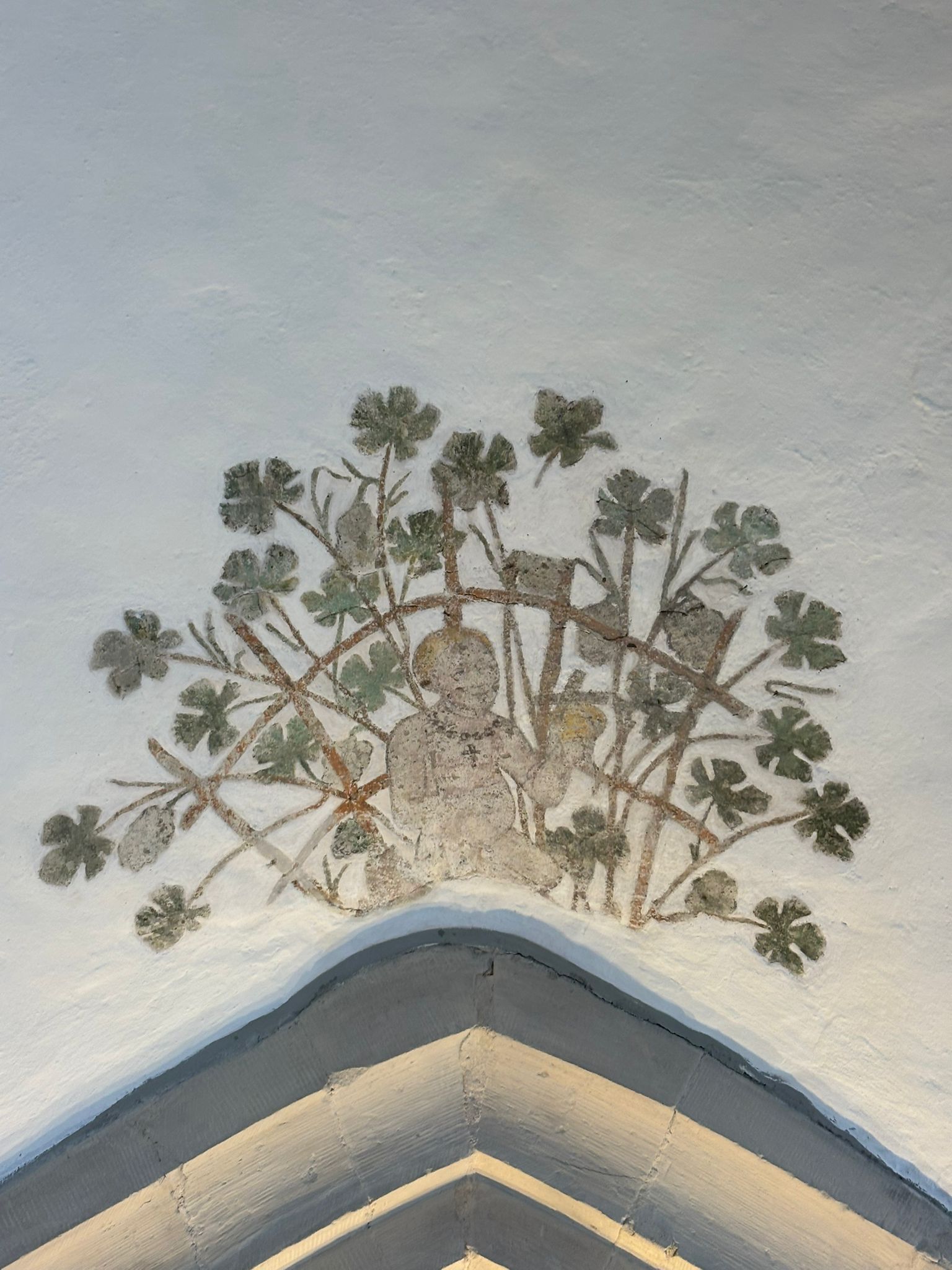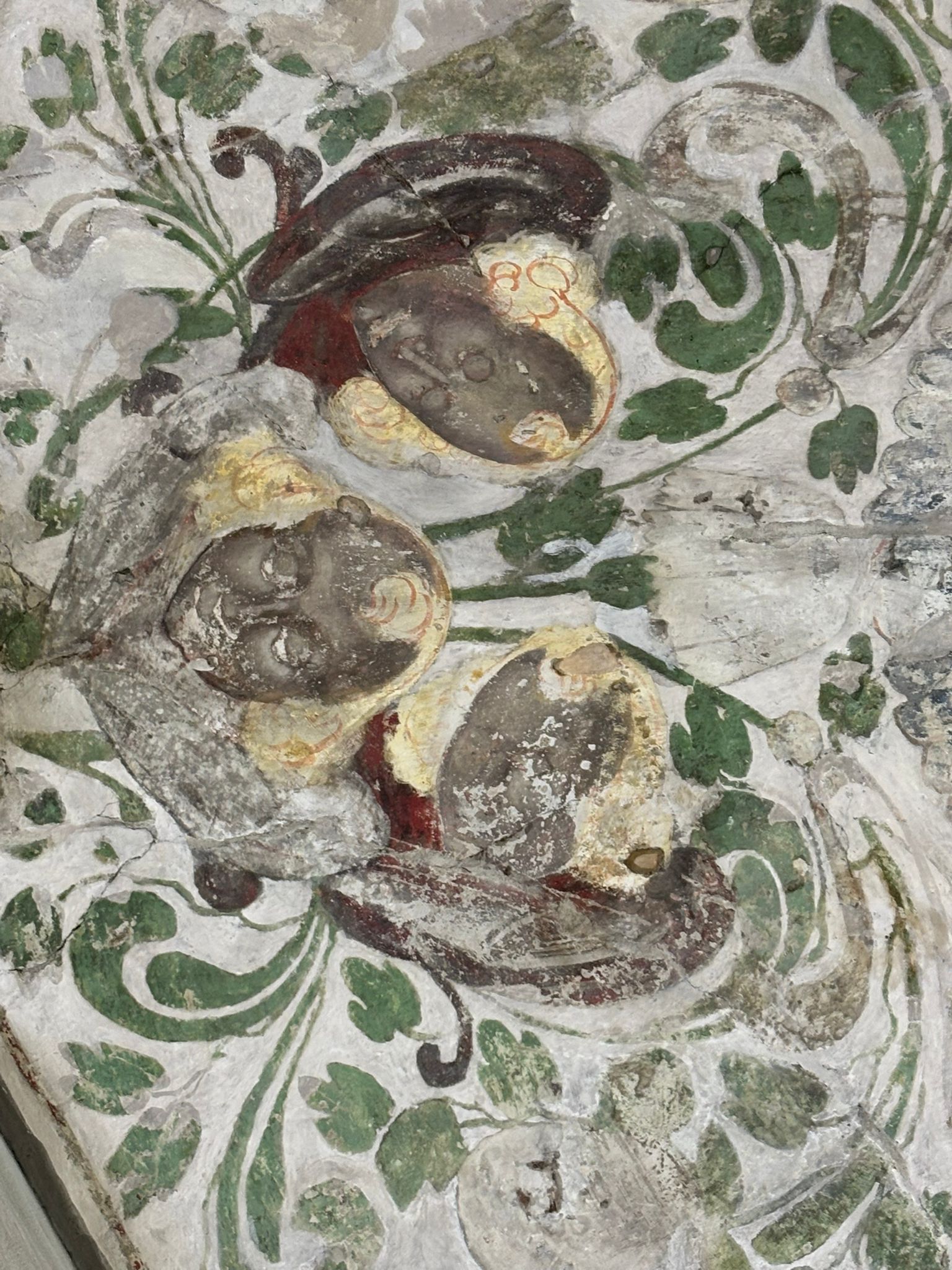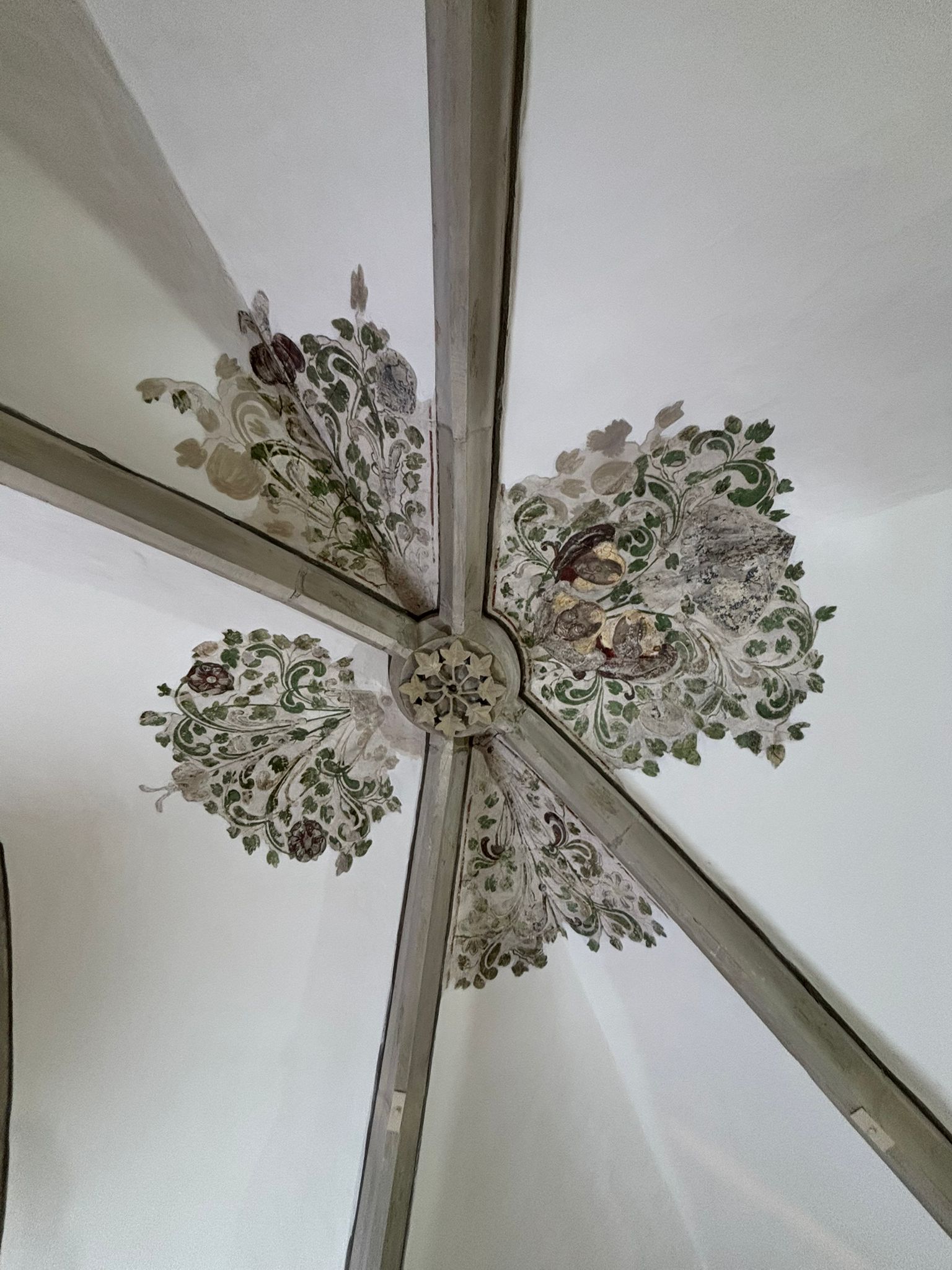 Auf dem Foto kann man sehr schön das freigelegte Blatt erkennen. So, wie dieses Blatt soll die gesamte Malerei freigelegt werden. Es gibt insgesamt 24 Malereien, welche freigelegt werden sollen. Spenden hier.