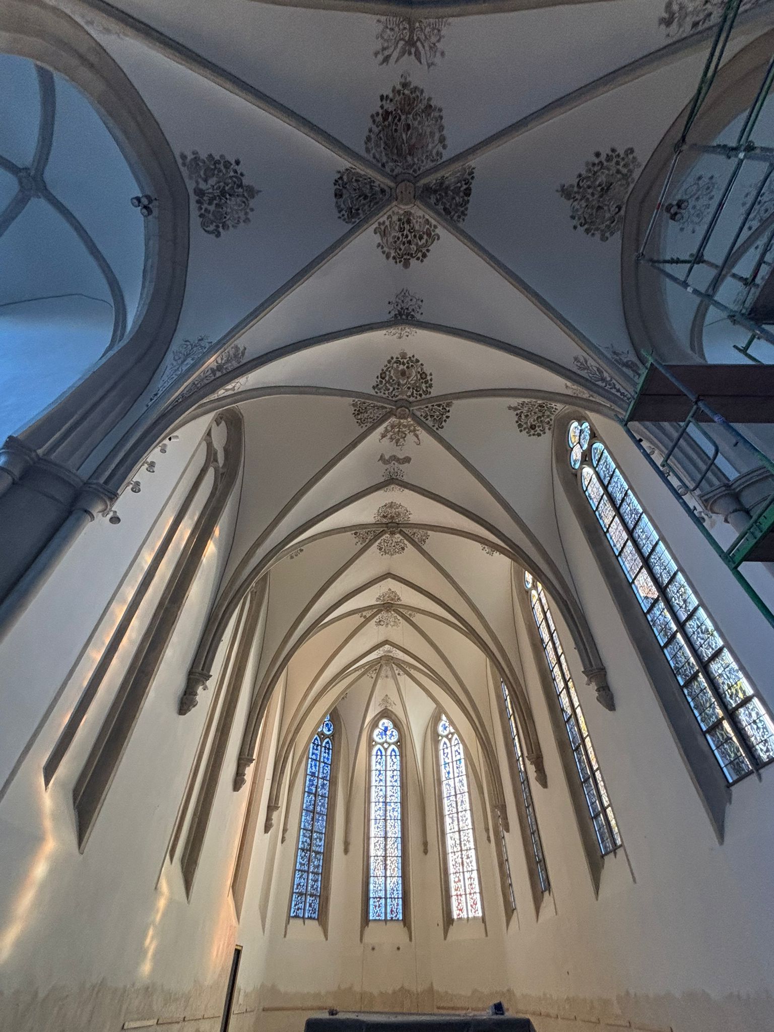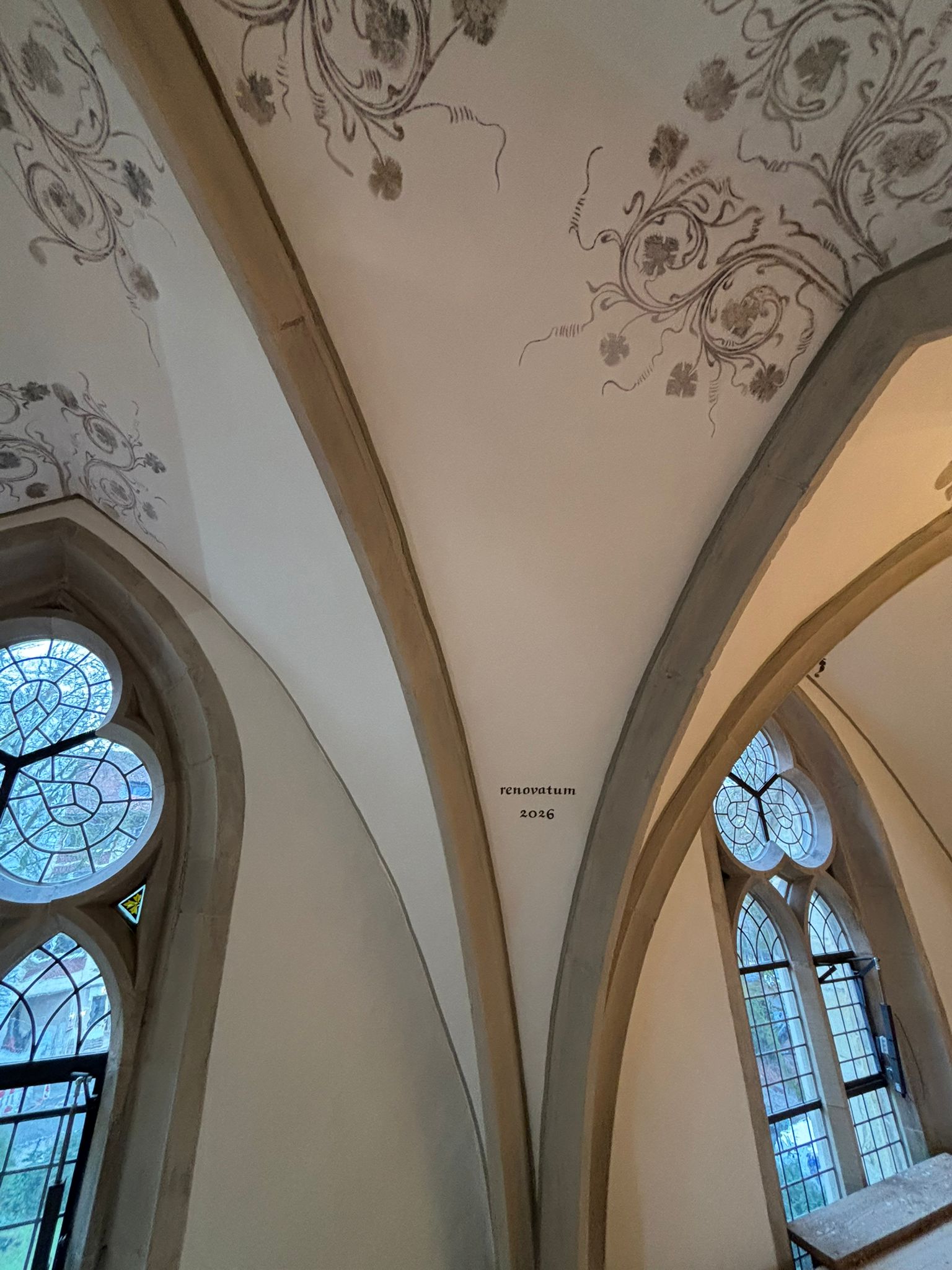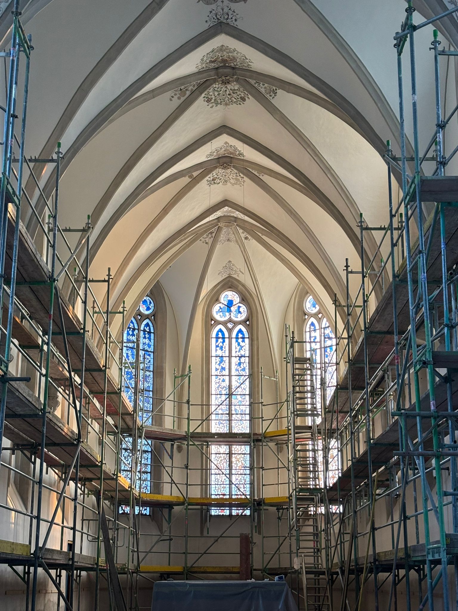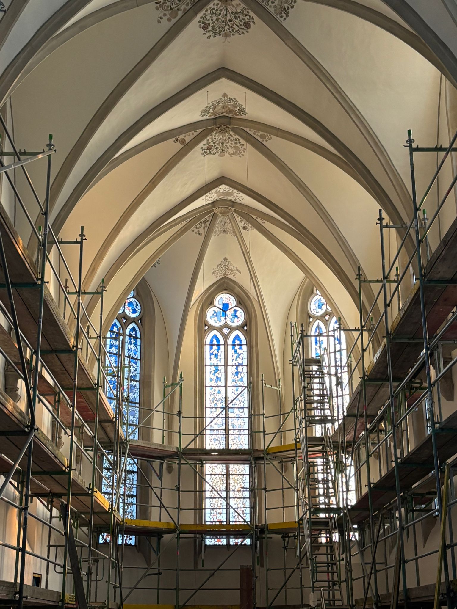 Ab Frühjahr 2025 bis voraussichtlich Jahresende erfolgt die Sanierung, Konservierung und Restaurierung der Wand- und Gewölbemalereien in der Apostelkirche. Hierzu wird eine statische Sicherung der Risse sowie eine Reinigung der Gewölbemalereien. Nachfolgend teilen wir einige Eindrücke.