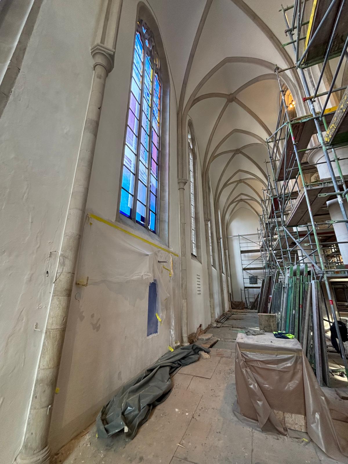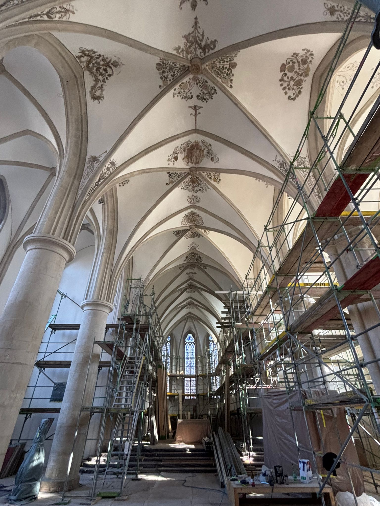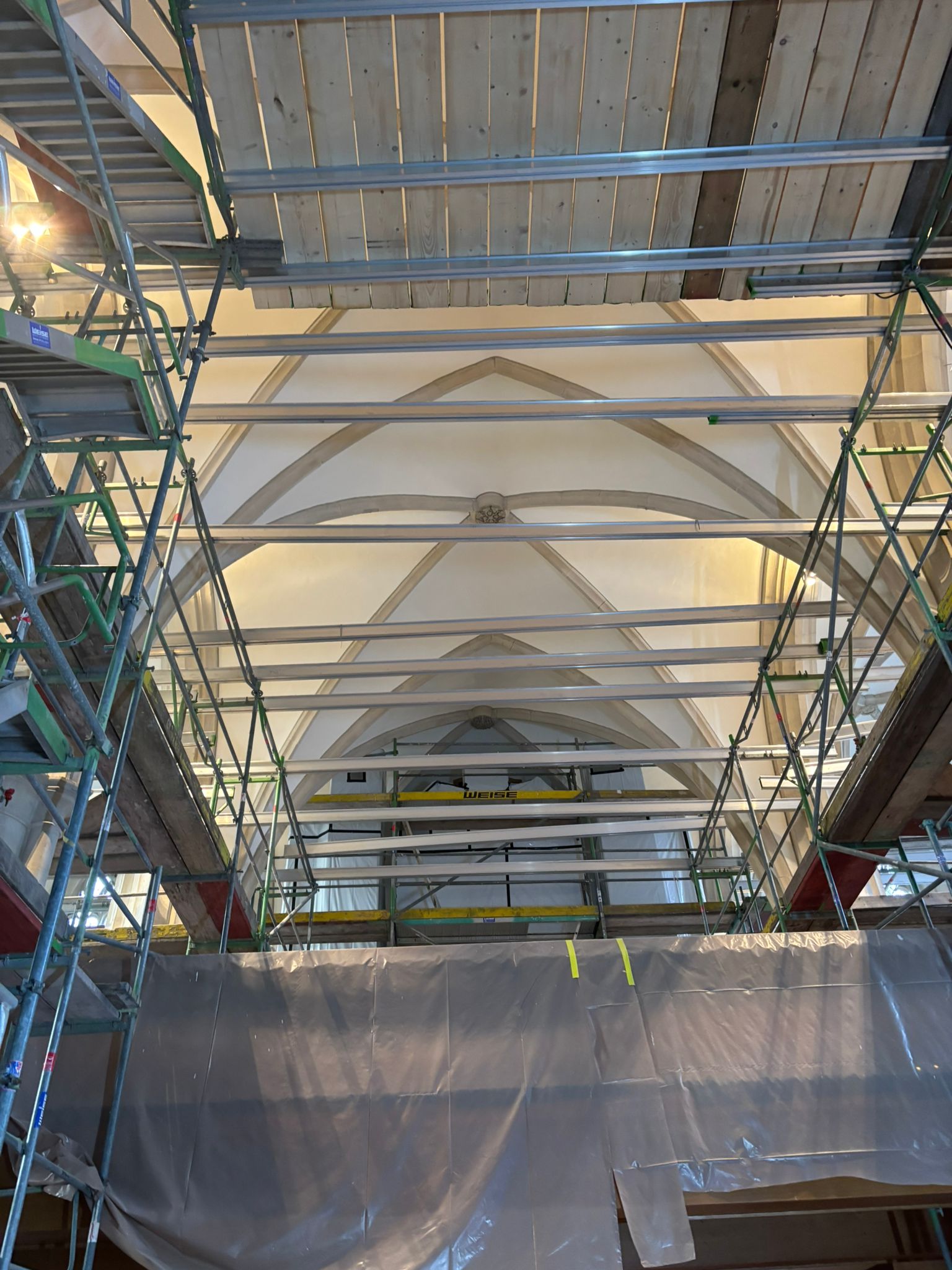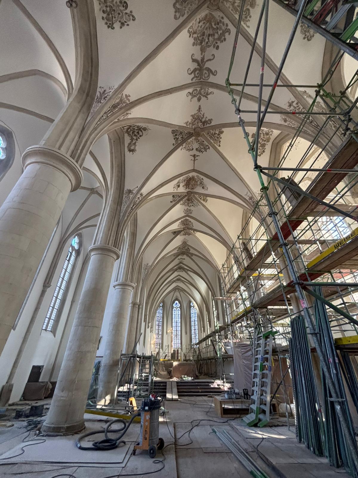 „Die Arbeiten an der Decke schreiten fort. Ein Steinmetzbetrieb beseitigt Schäden an den Gewölberippen.