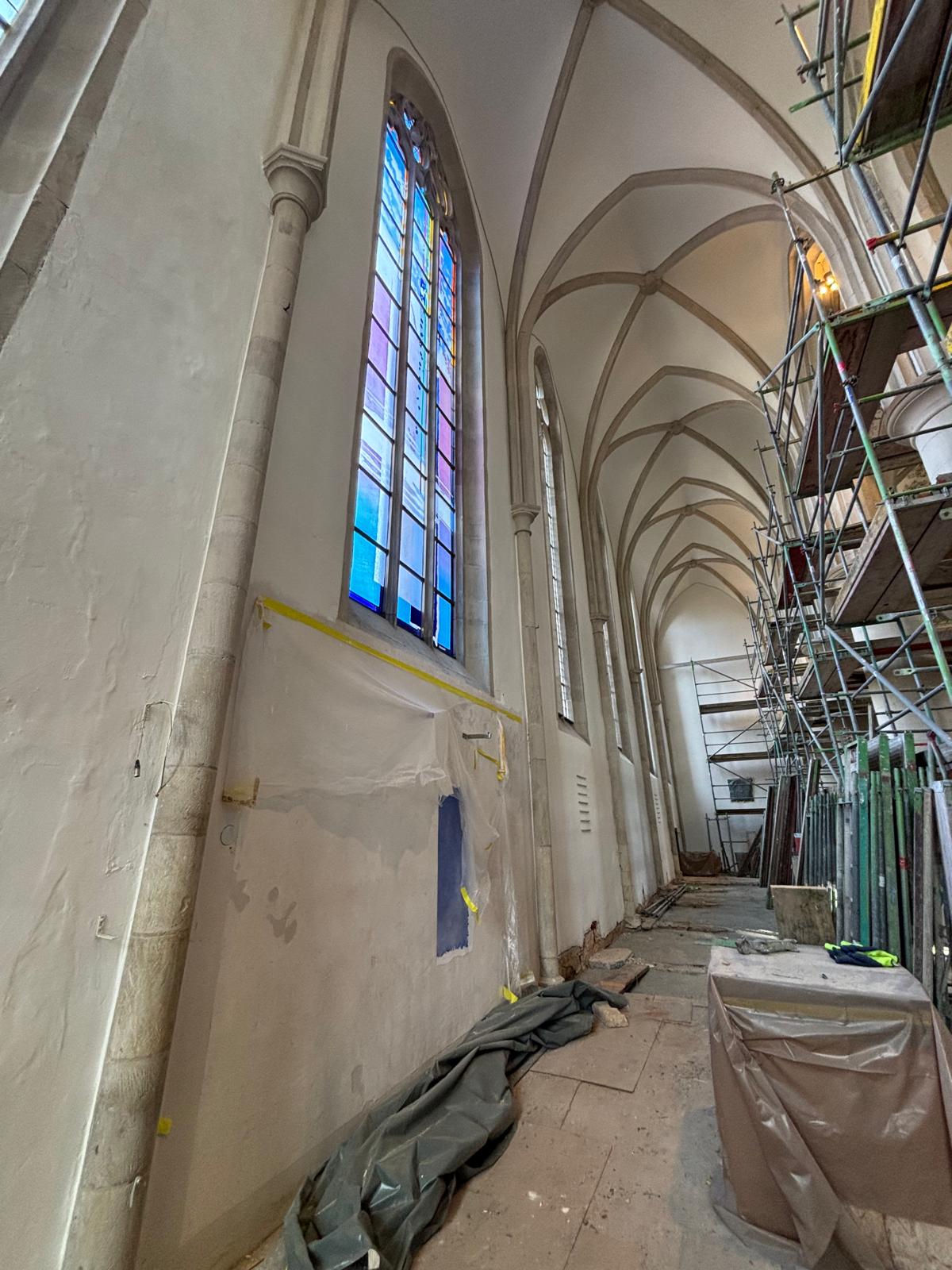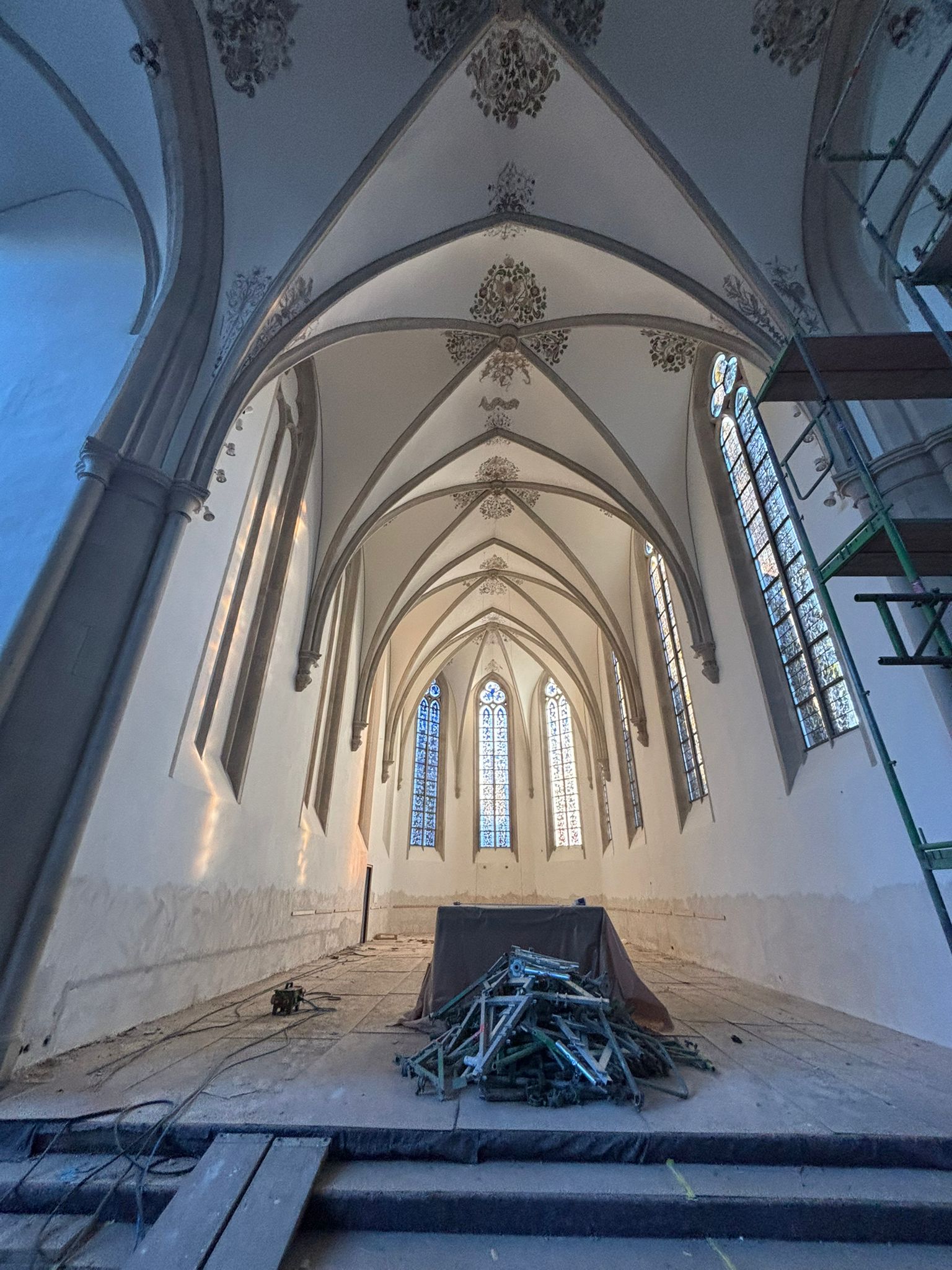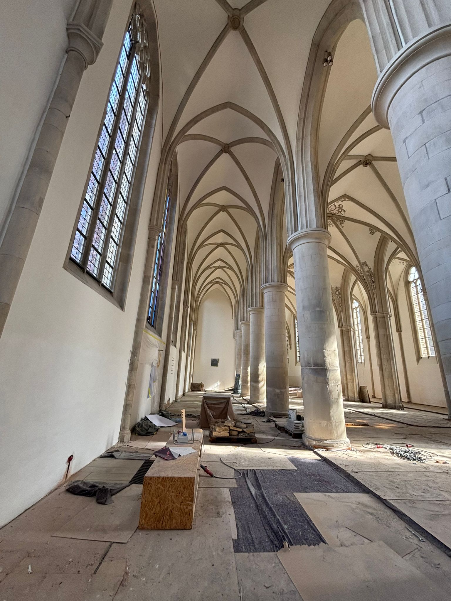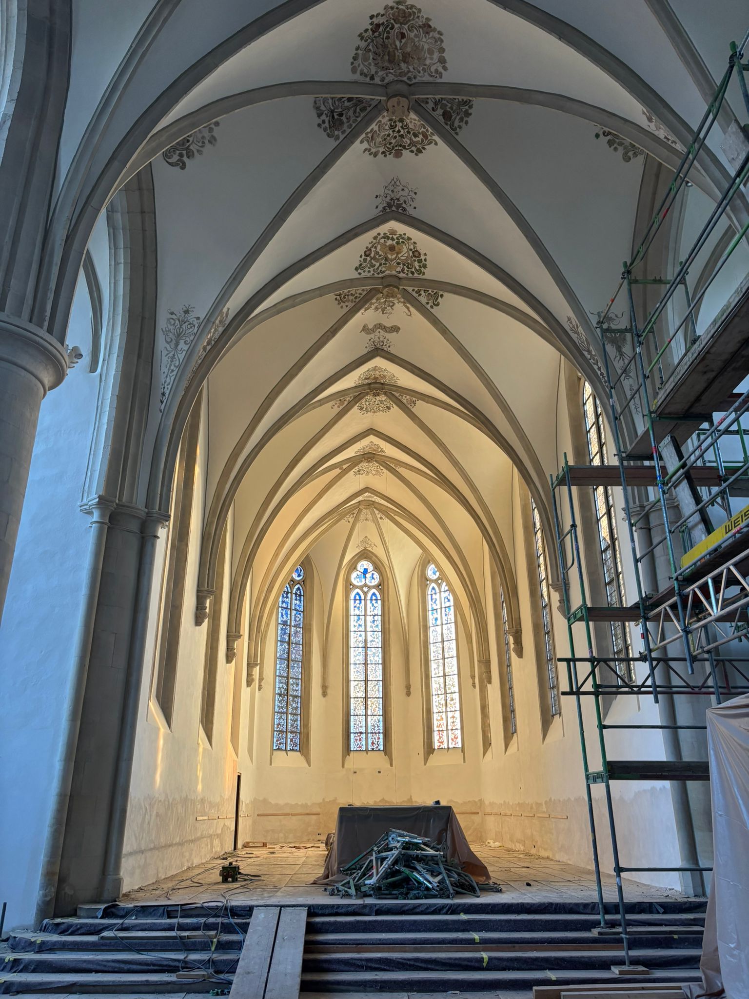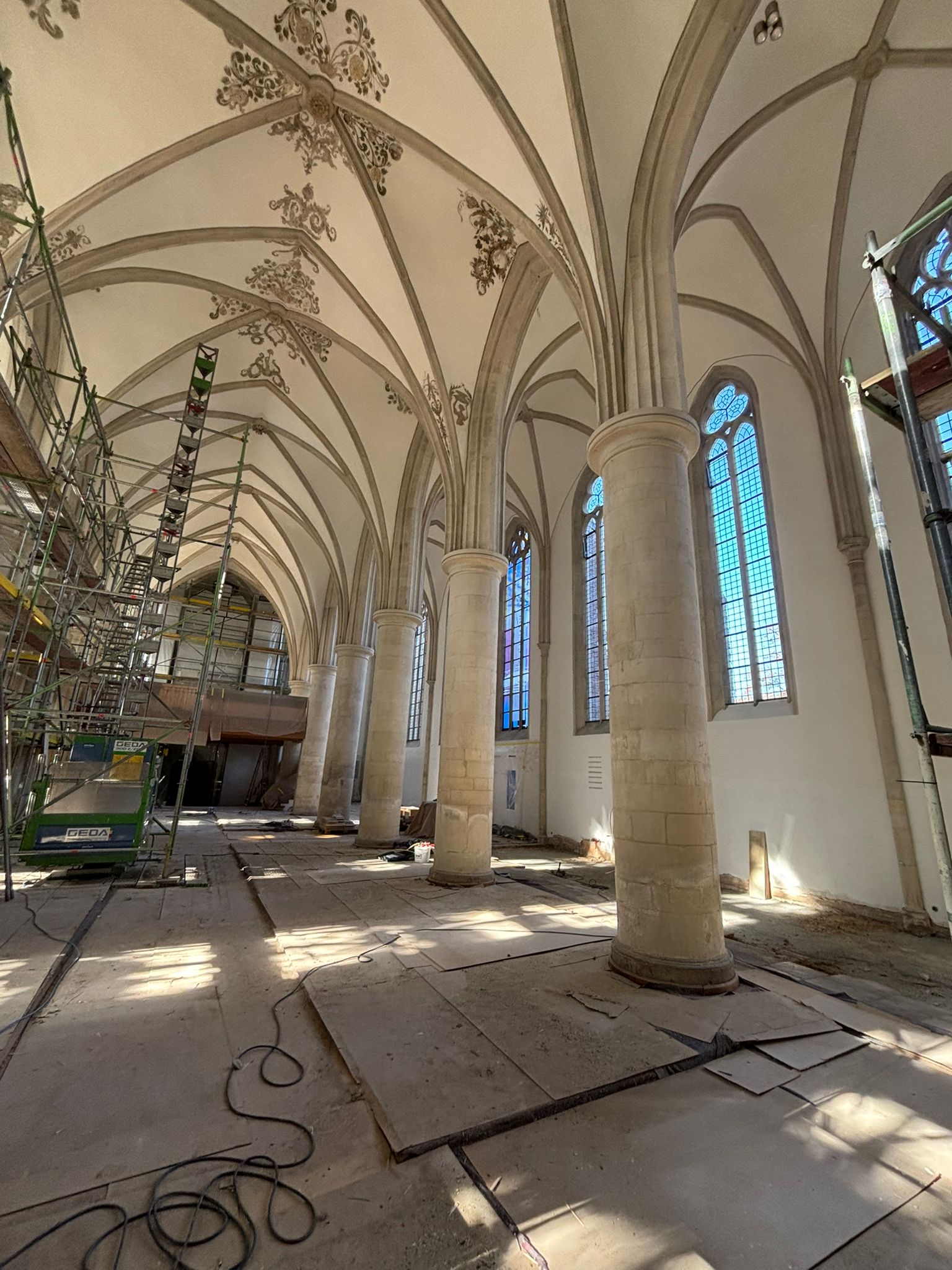 „Die Arbeiten an der Decke schreiten fort. Ein Steinmetzbetrieb beseitigt Schäden an den Gewölberippen.