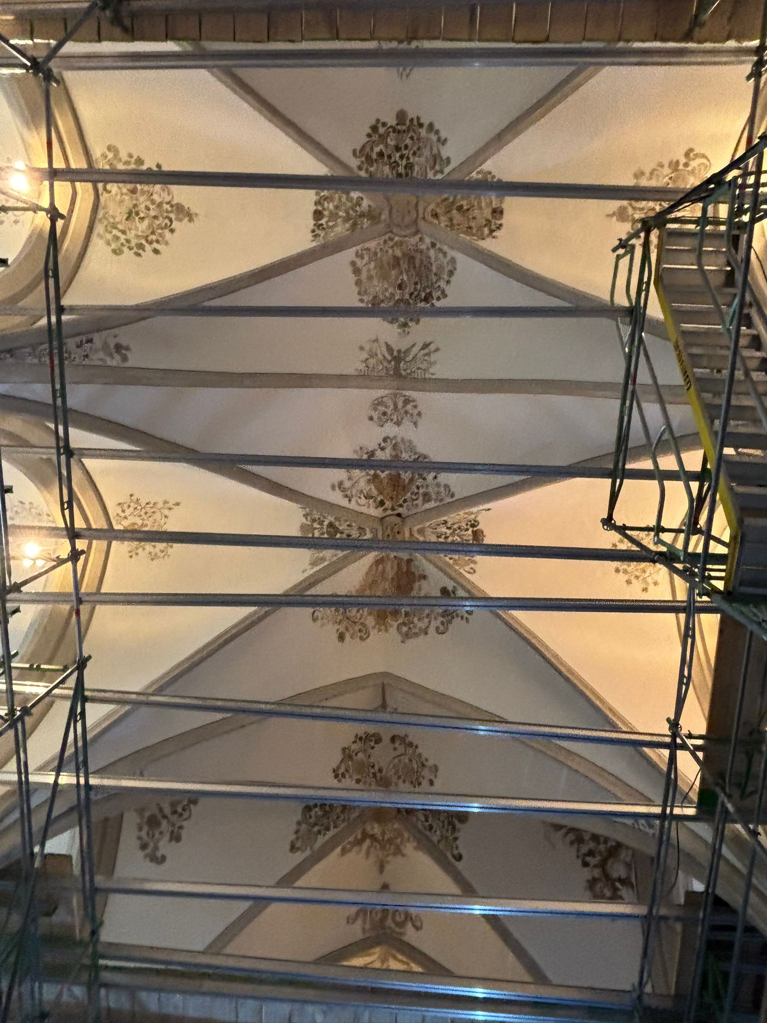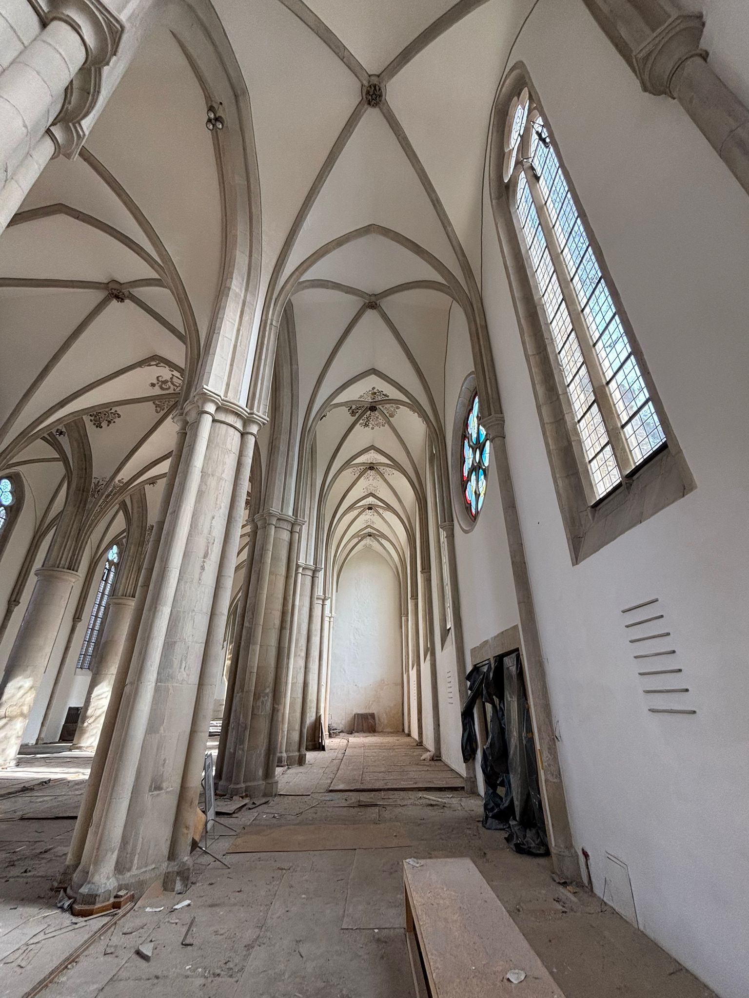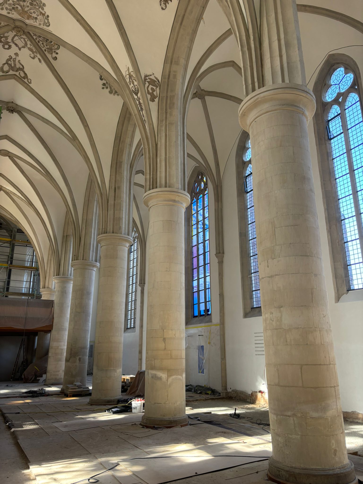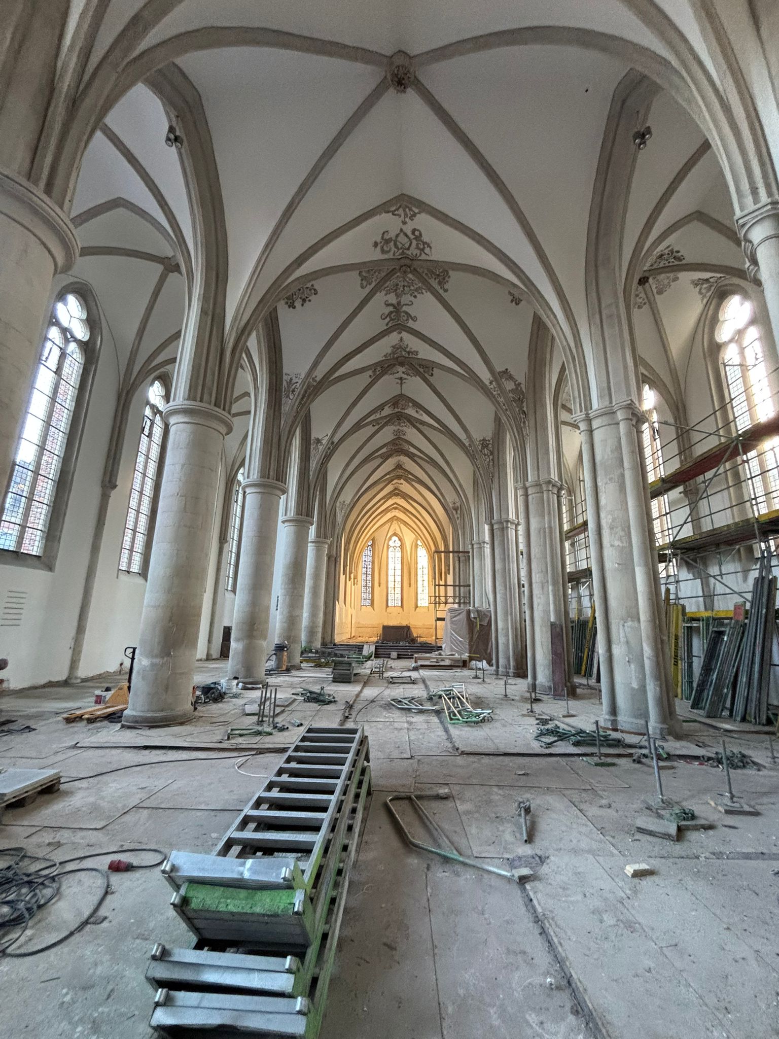 „Die Arbeiten an der Decke schreiten fort. Ein Steinmetzbetrieb beseitigt Schäden an den Gewölberippen.