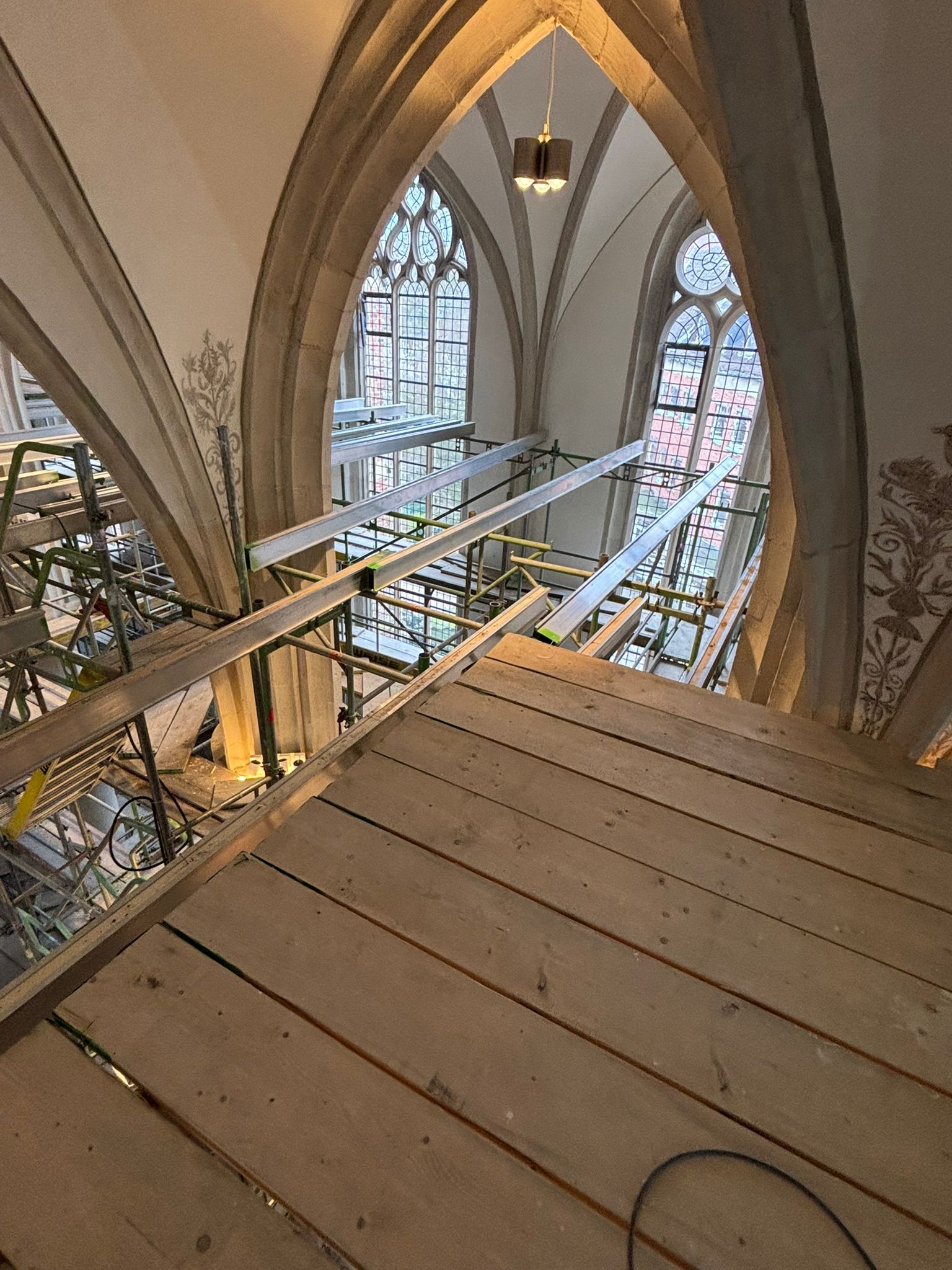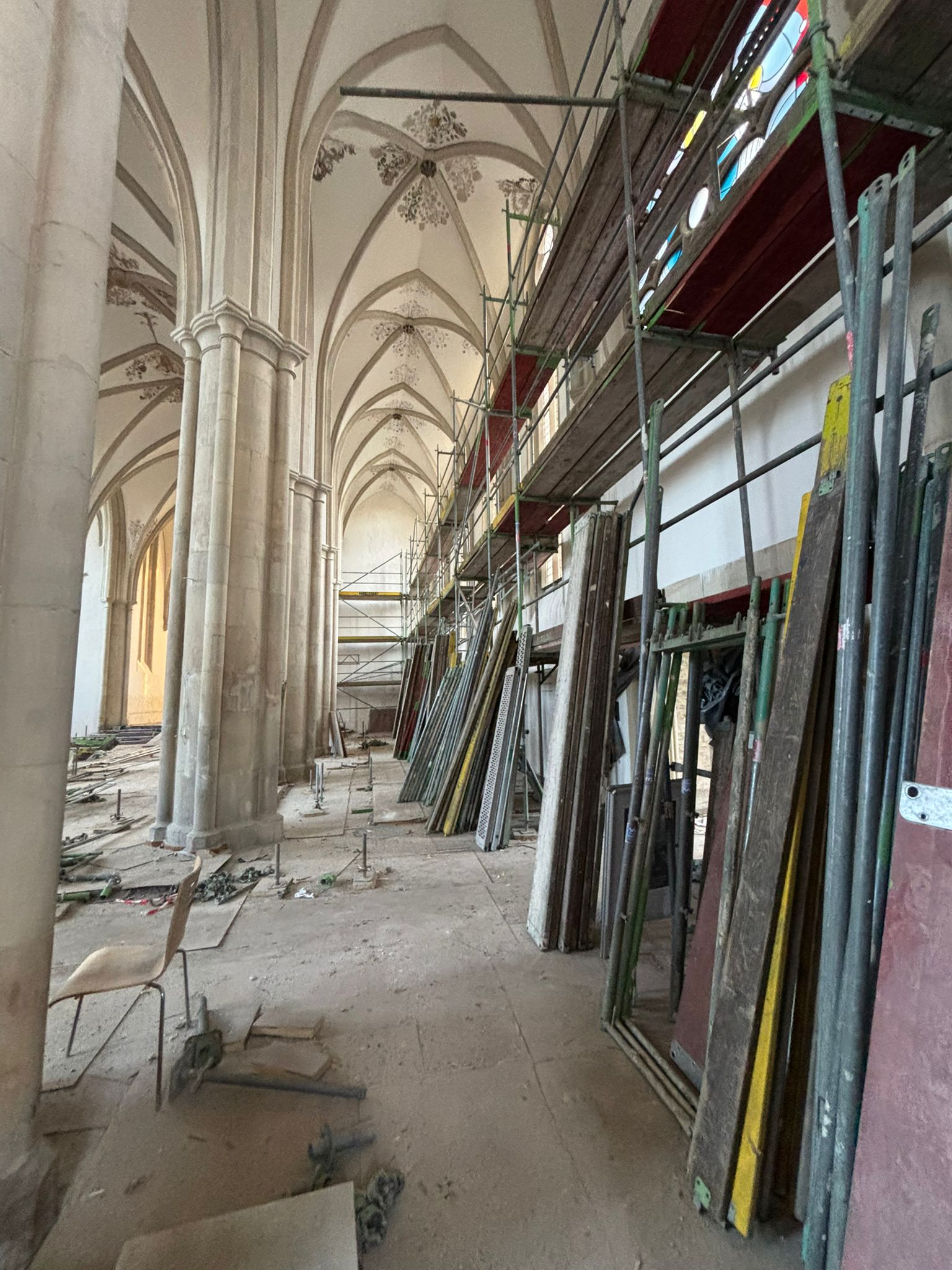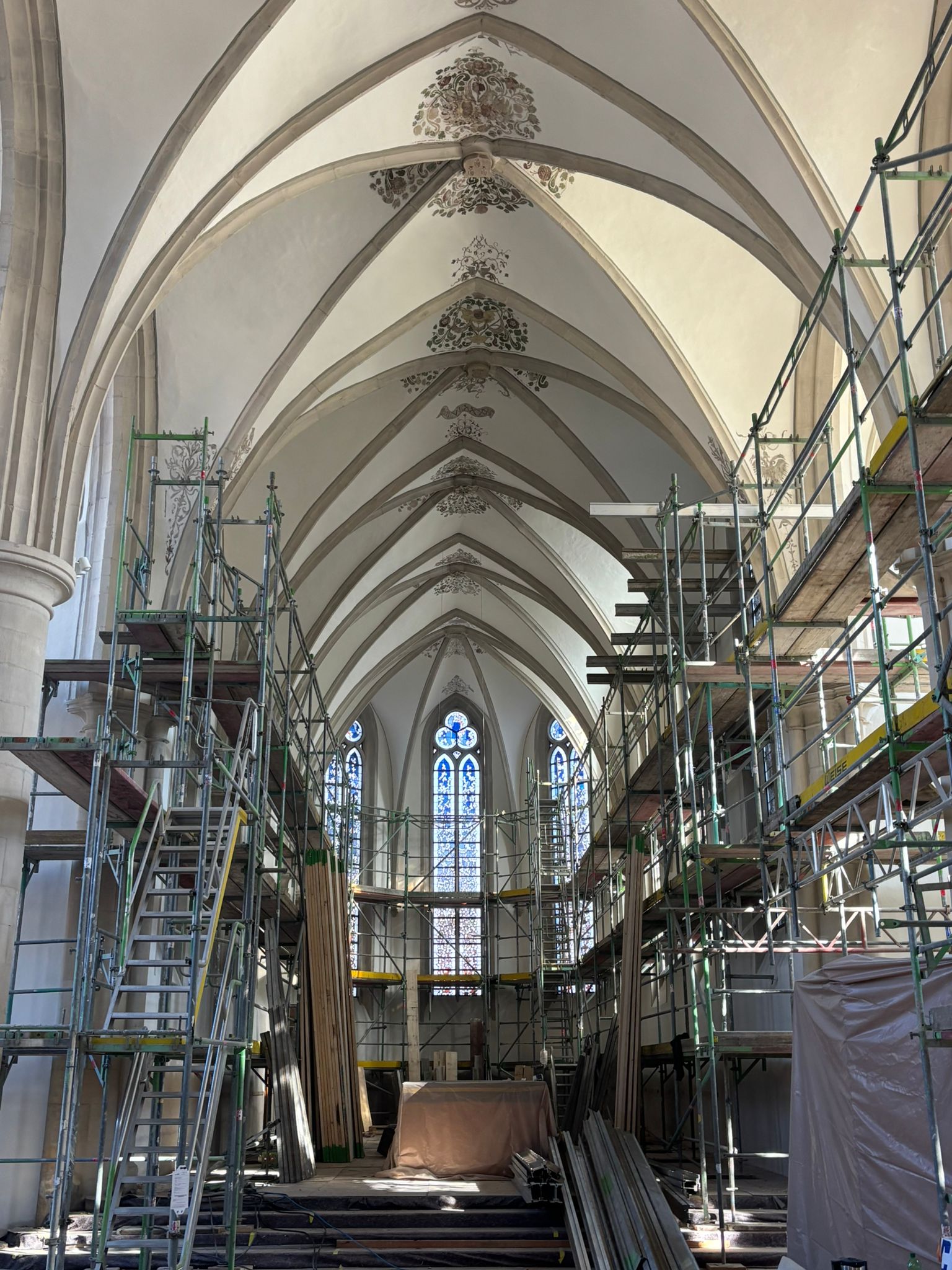 Die Orgeleinhausung wurde gerade abgeschlossen. Es sind weitere Einbauten und Türen gesichert worden. Die Sandsteinbänke im Chorbereich wurden in die Mitte versetzt. Die Gerüstbauer sind nun täglich vor Ort.
