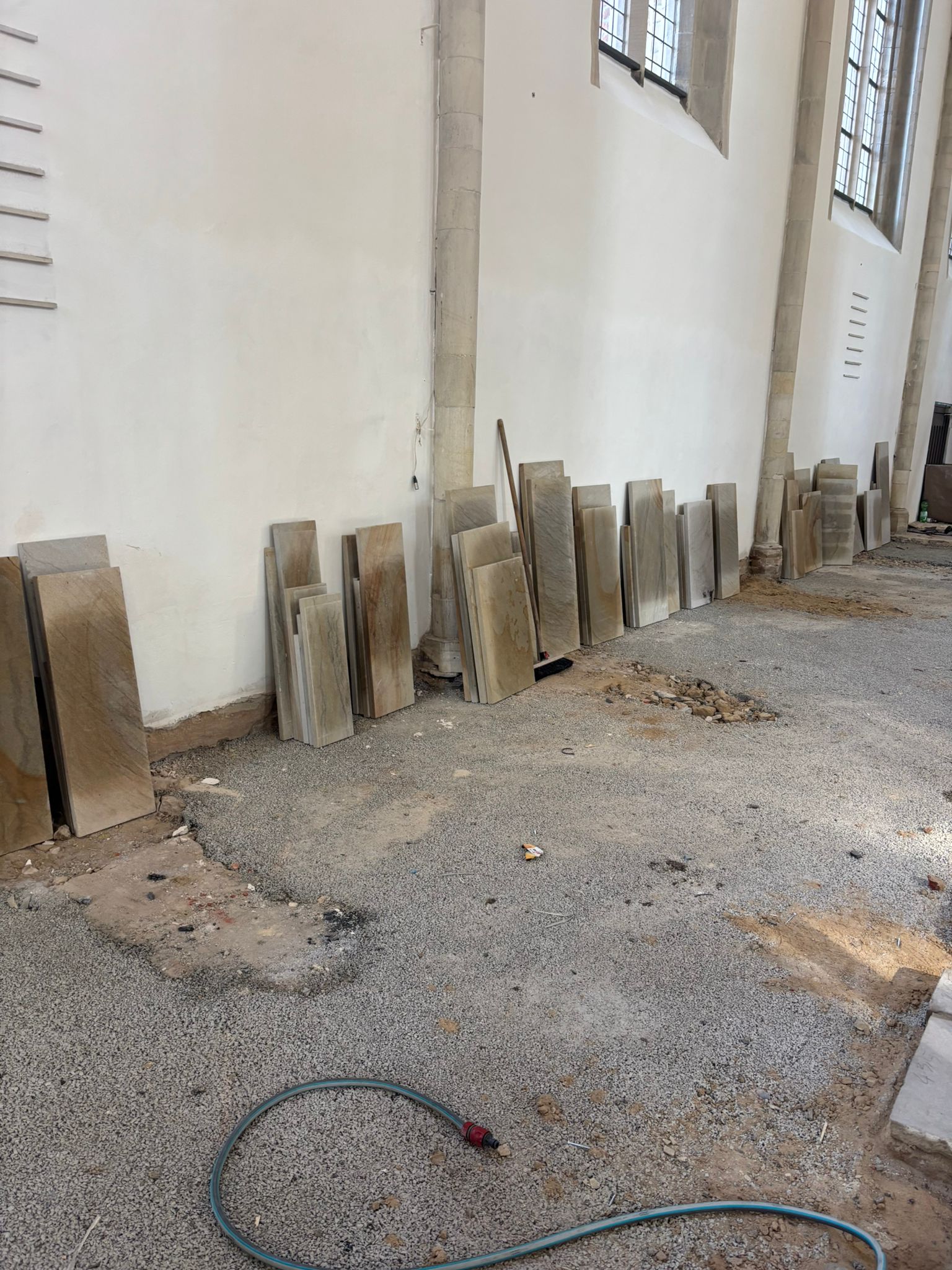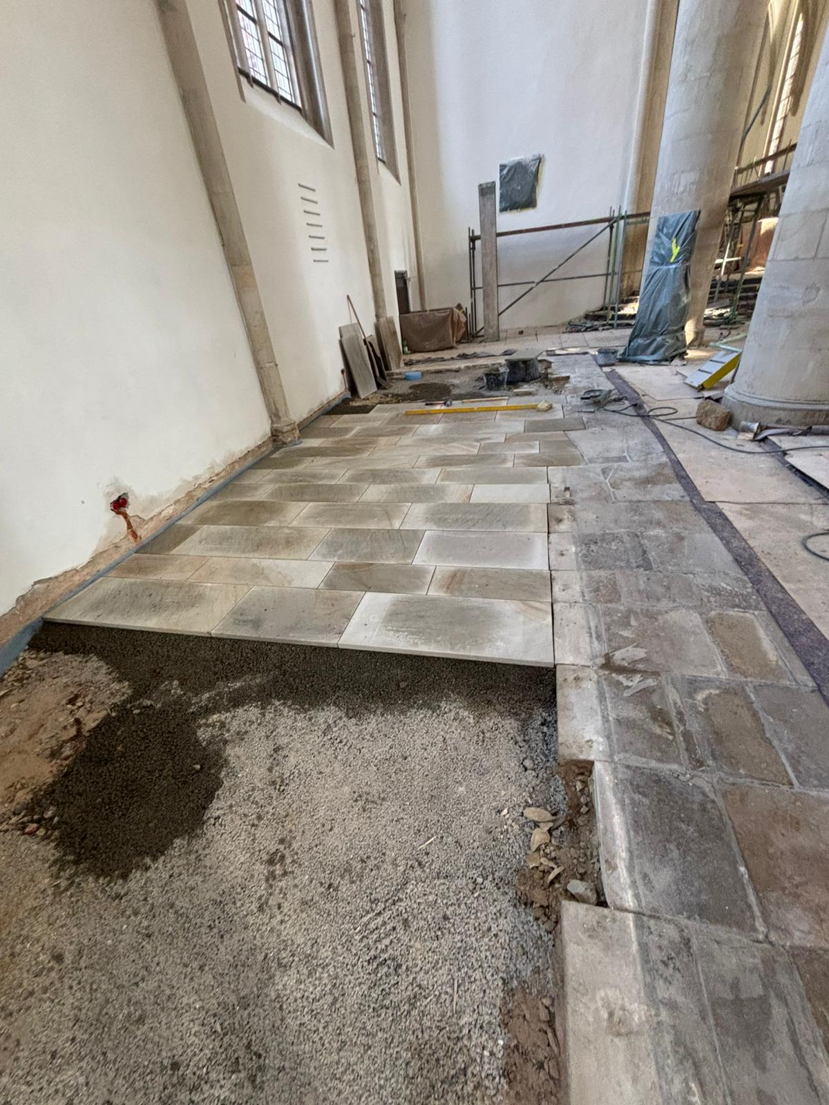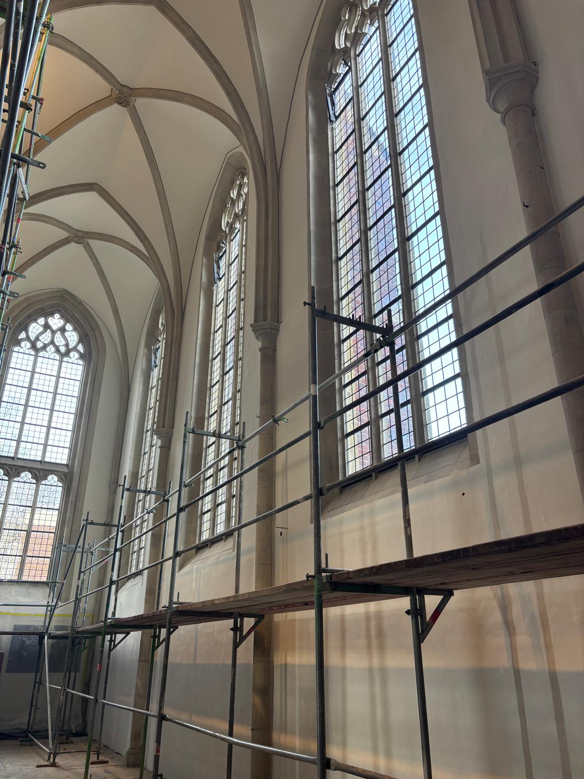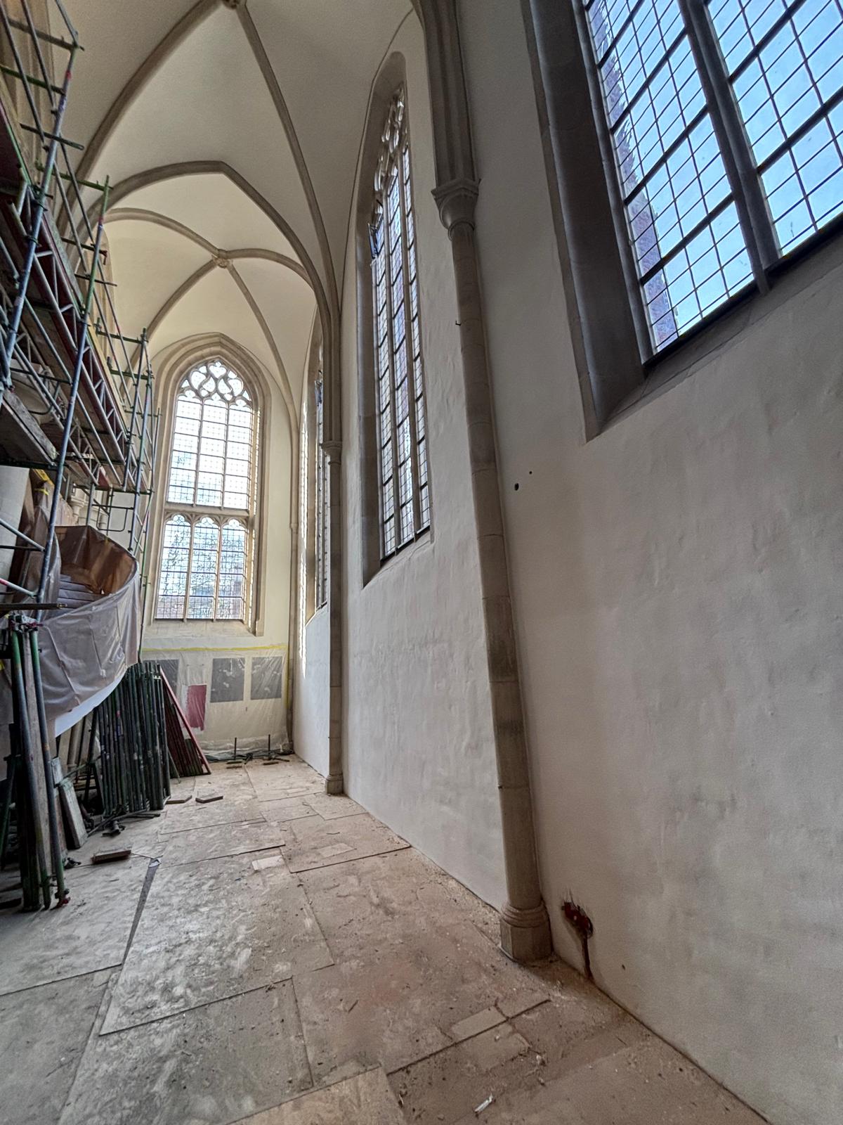 Die Orgeleinhausung wurde gerade abgeschlossen. Es sind weitere Einbauten und Türen gesichert worden. Die Sandsteinbänke im Chorbereich wurden in die Mitte versetzt. Die Gerüstbauer sind nun täglich vor Ort.