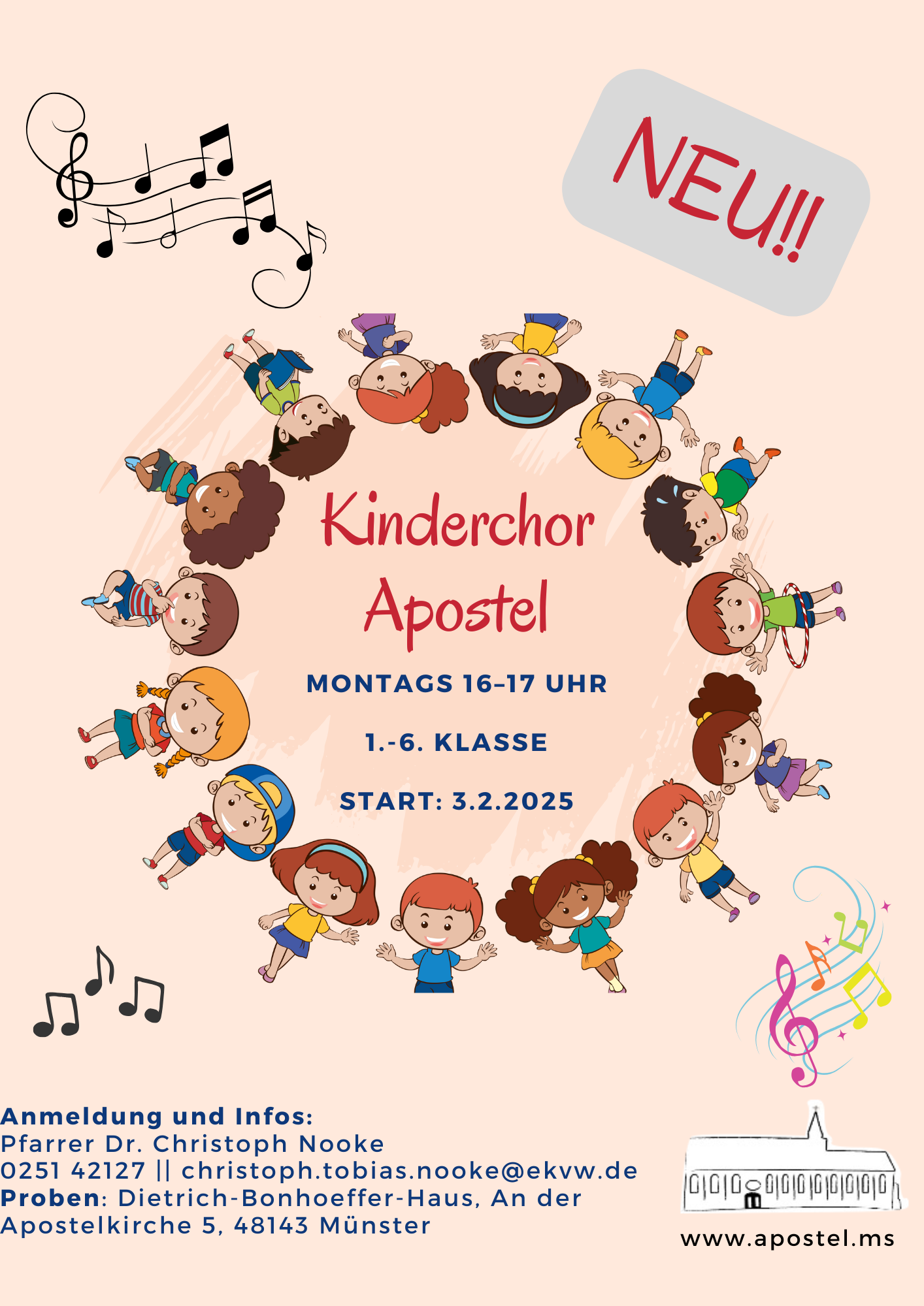 Ab dem 3. Februar 2025 startet unser neuer Kinderchor „Apostel“! Alle Kinder der 1. bis 6. Klasse sind herzlich eingeladen, mit uns die Freude am Singen zu entdecken. Die Proben finden jeden Montag von 16 bis 17 Uhr im Dietrich-Bonhoeffer-Haus (An der Apostelkirche 5, 48143 Münster) statt.