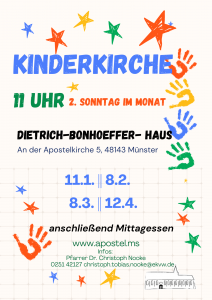 Einmal im Monat, in der Regel am 2. Sonntag im Monat, sind alle Kinder im Alter von 0 bis 10 Jahren mit ihren Familien eingeladen zur Kinderkirche um 11:00 Uhr im Dietrich-Bonhoeffer-Haus mit anschließendem gemeinsamen Mittagessen.